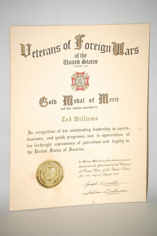 Téléchargement gratuit Ted Williams Vfw Gold Medal Of Merit Citation Award